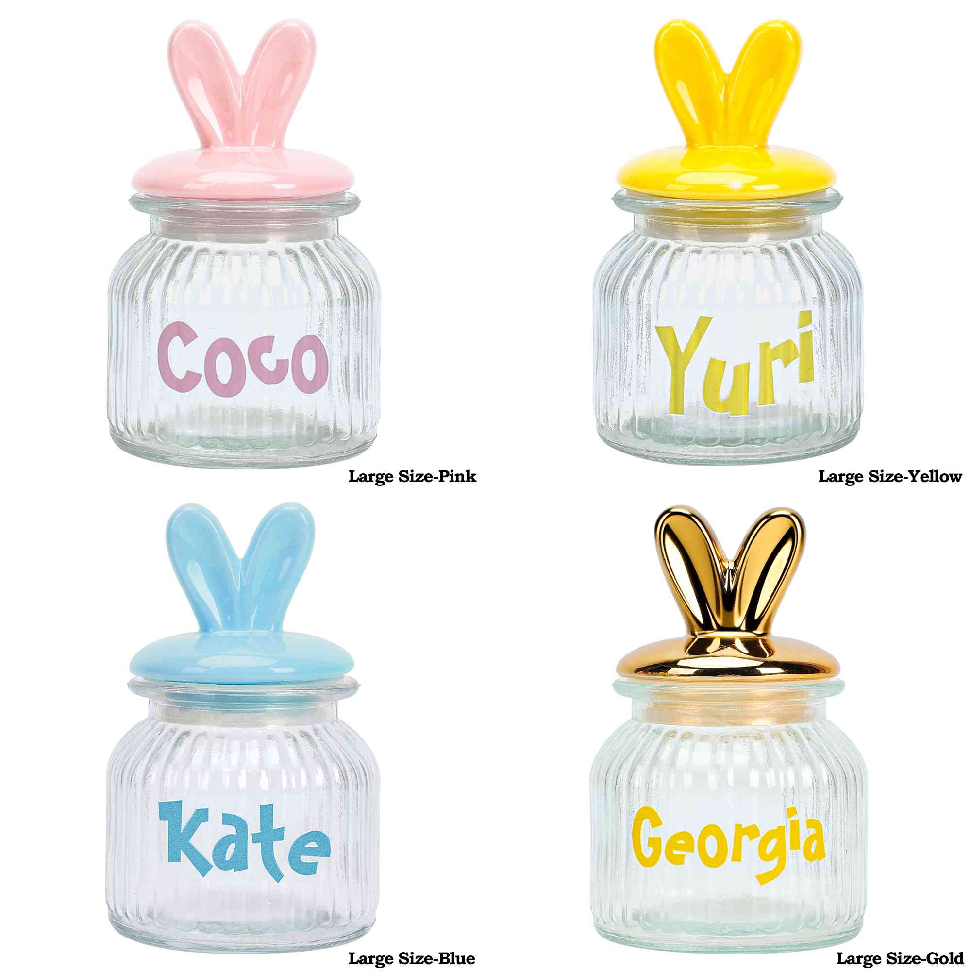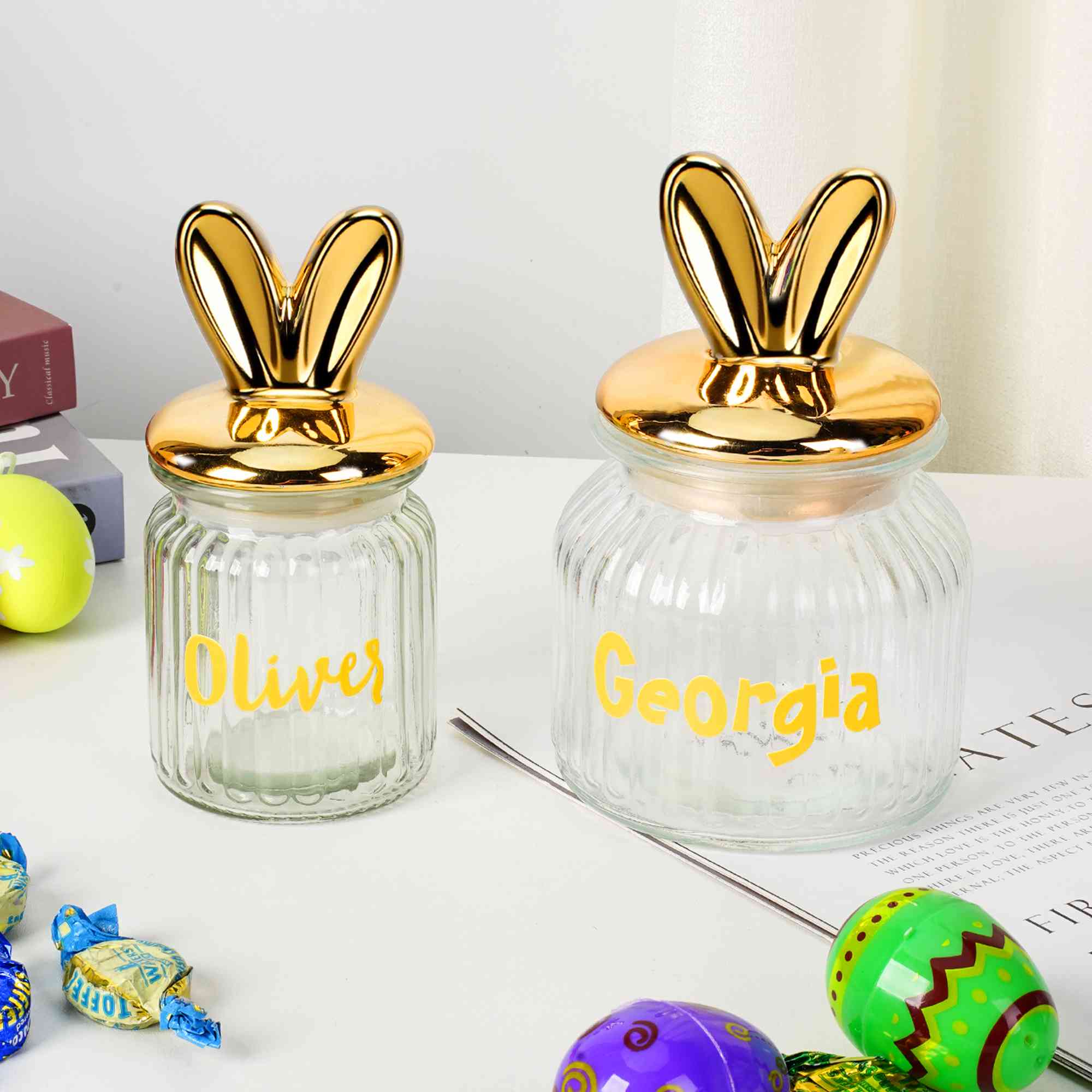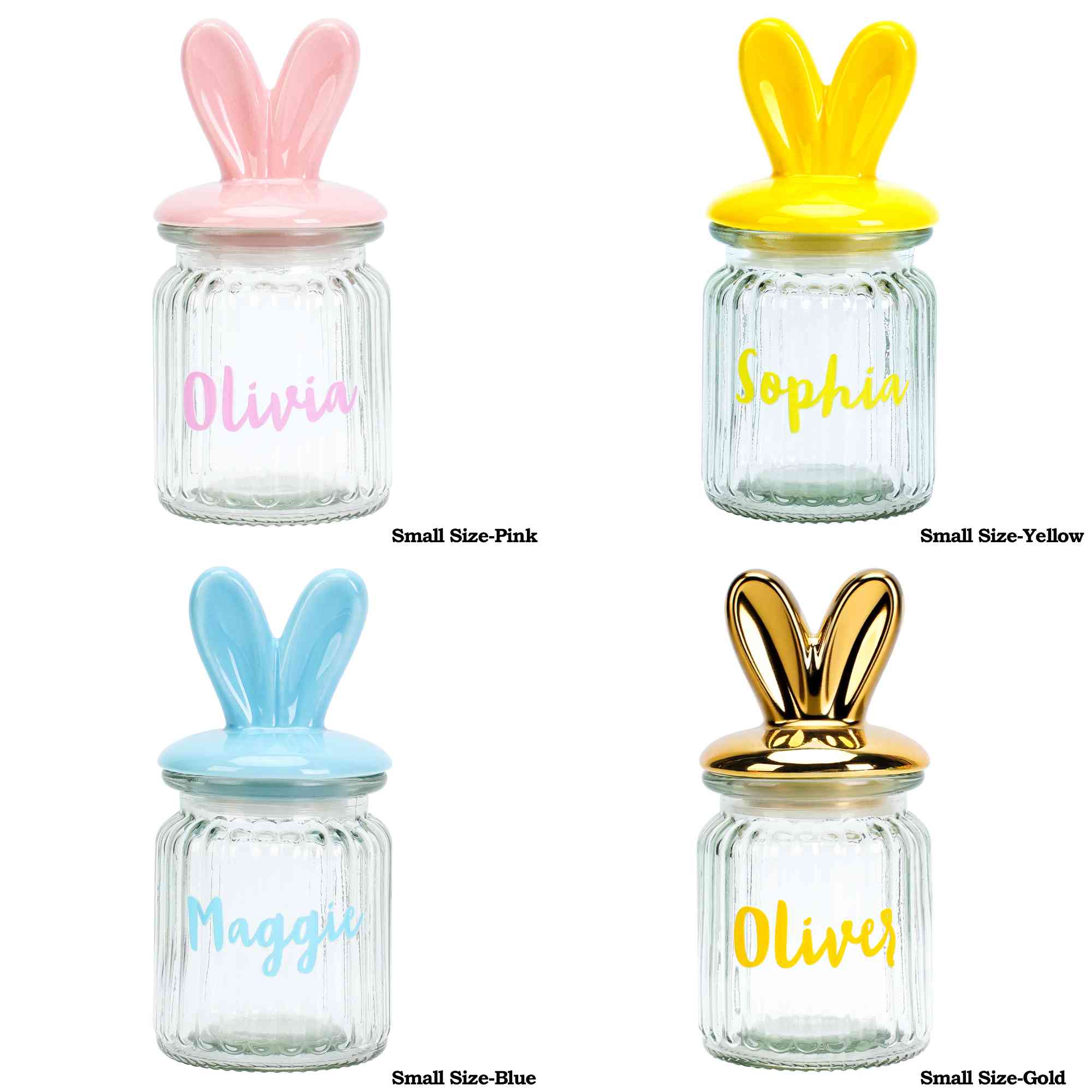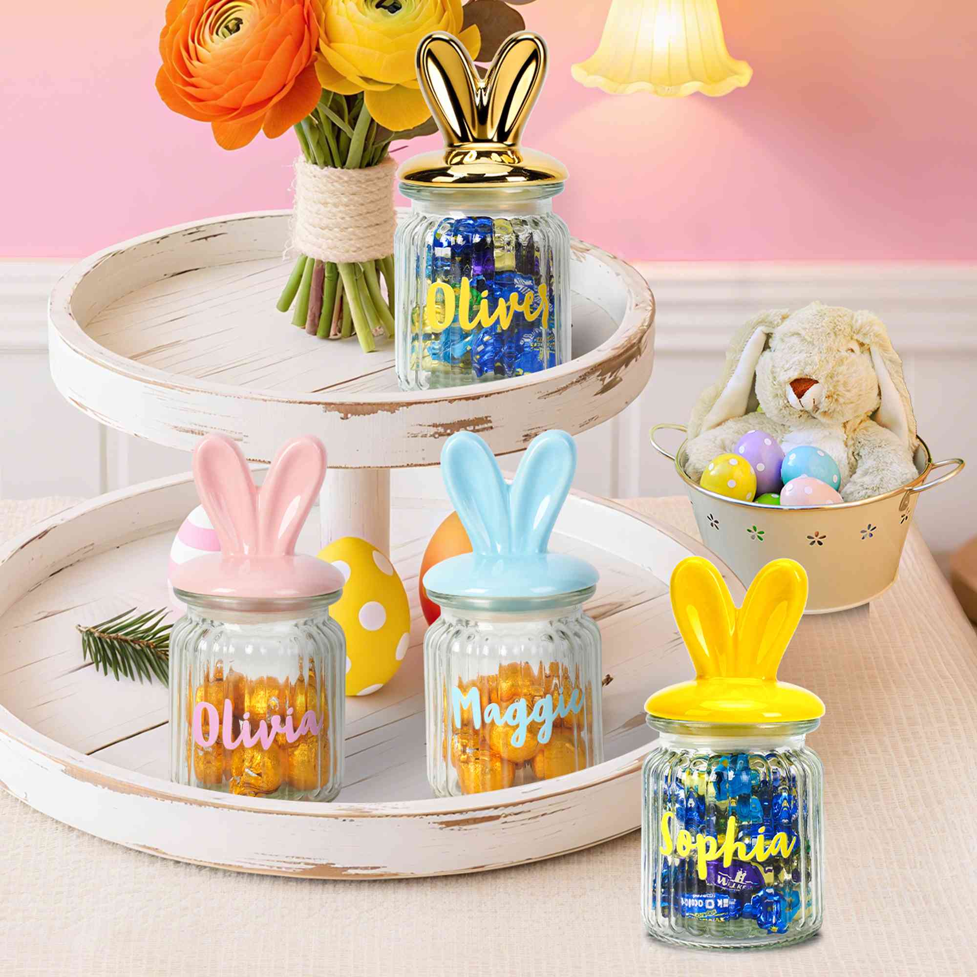 Custom Design - This adorable glass jar Can be personalized with a name of your choice for added personalization. It features a whimsical lid shaped like bunny ears, adding a festive touch to your Easter celebrations while delighting kids and adults alike.
