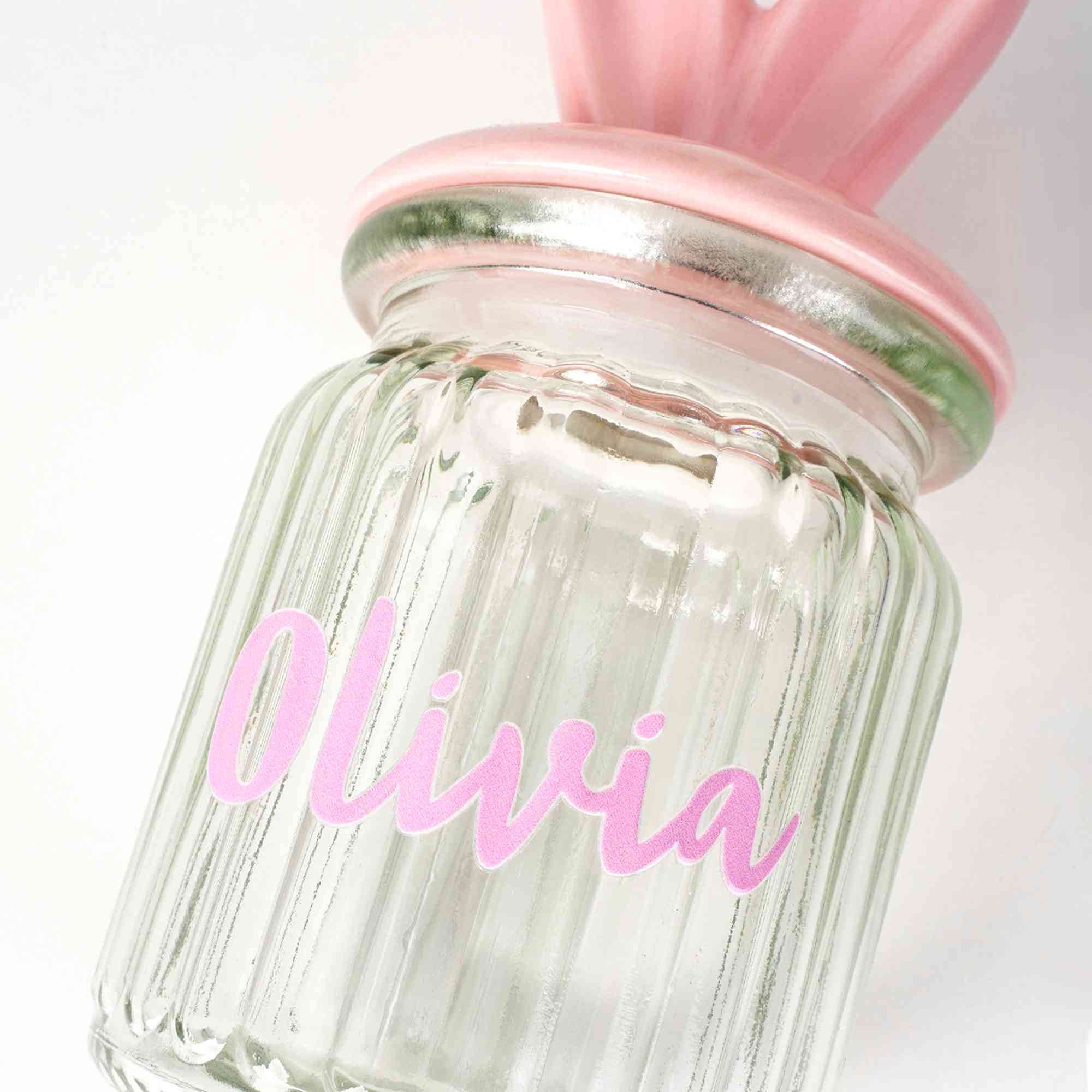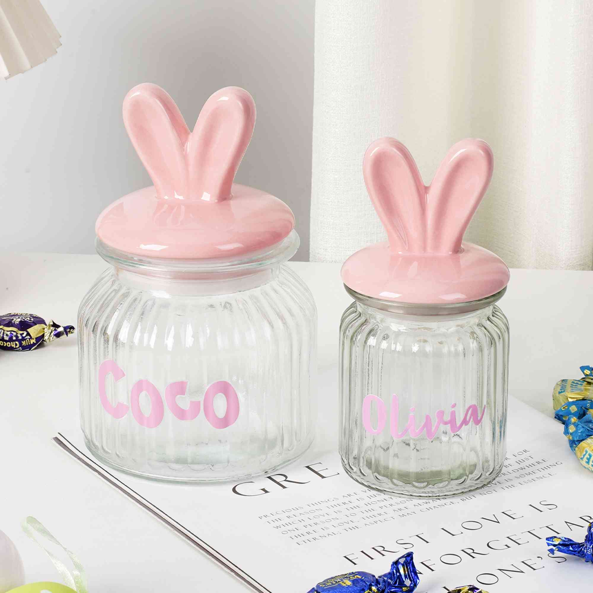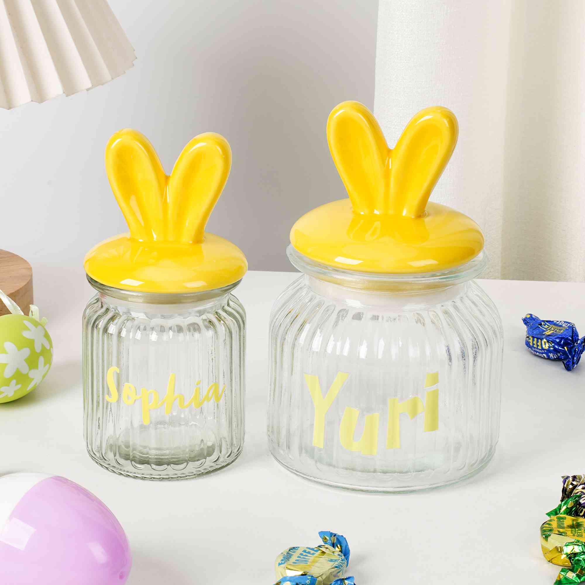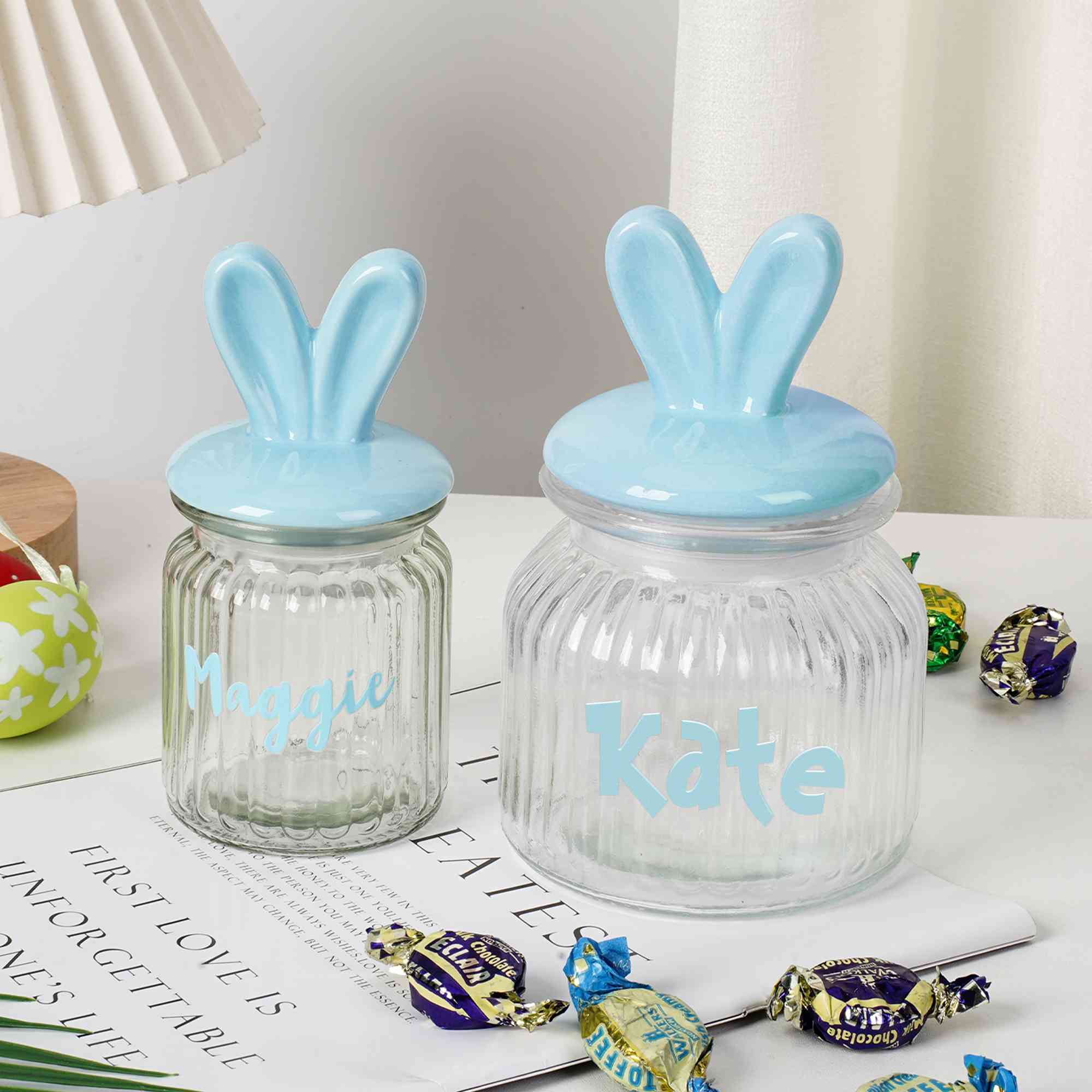 Custom Design - This adorable glass jar Can be personalized with a name of your choice for added personalization. It features a whimsical lid shaped like bunny ears, adding a festive touch to your Easter celebrations while delighting kids and adults alike.